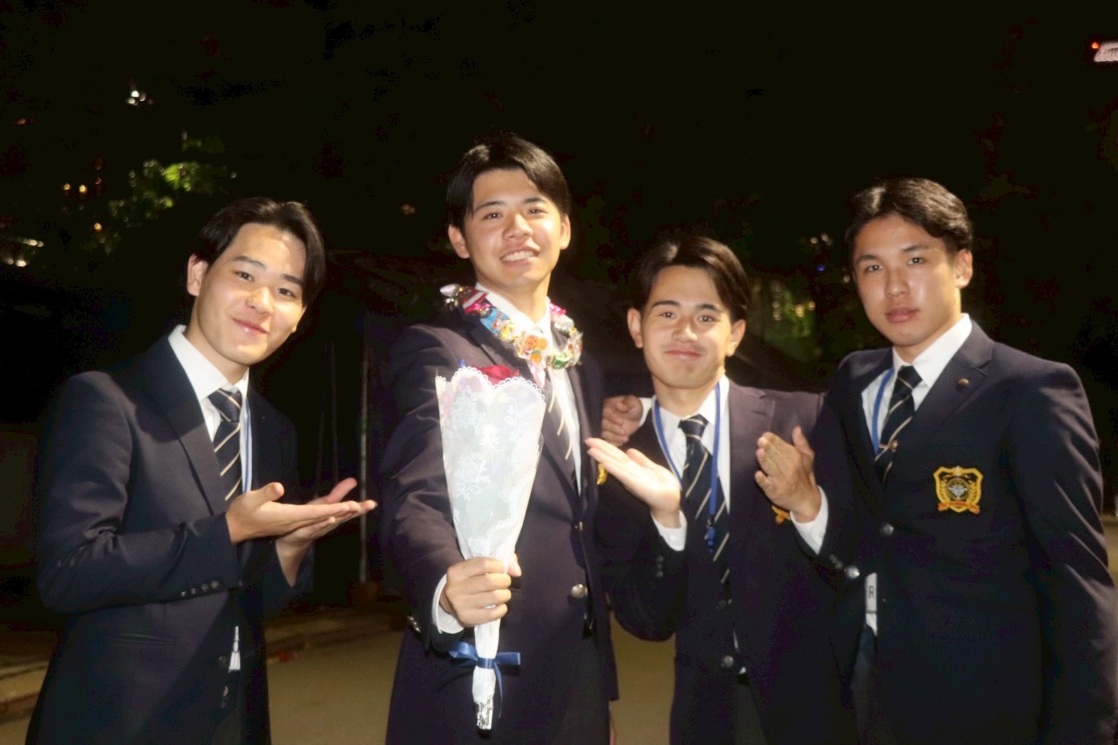 この度は、素晴らしい引退セレモニーを開催していただきありがとうございました。目標としていた優勝を成し遂げることができず、春秋ともに非常に悔しい思いをしましたが、こうして4年生の引退を盛大に祝福してくれたこと、とても嬉しく思います。今まで支えてくださったすべての皆様、本当にありがとうございました。