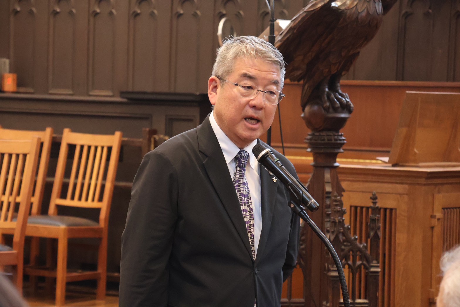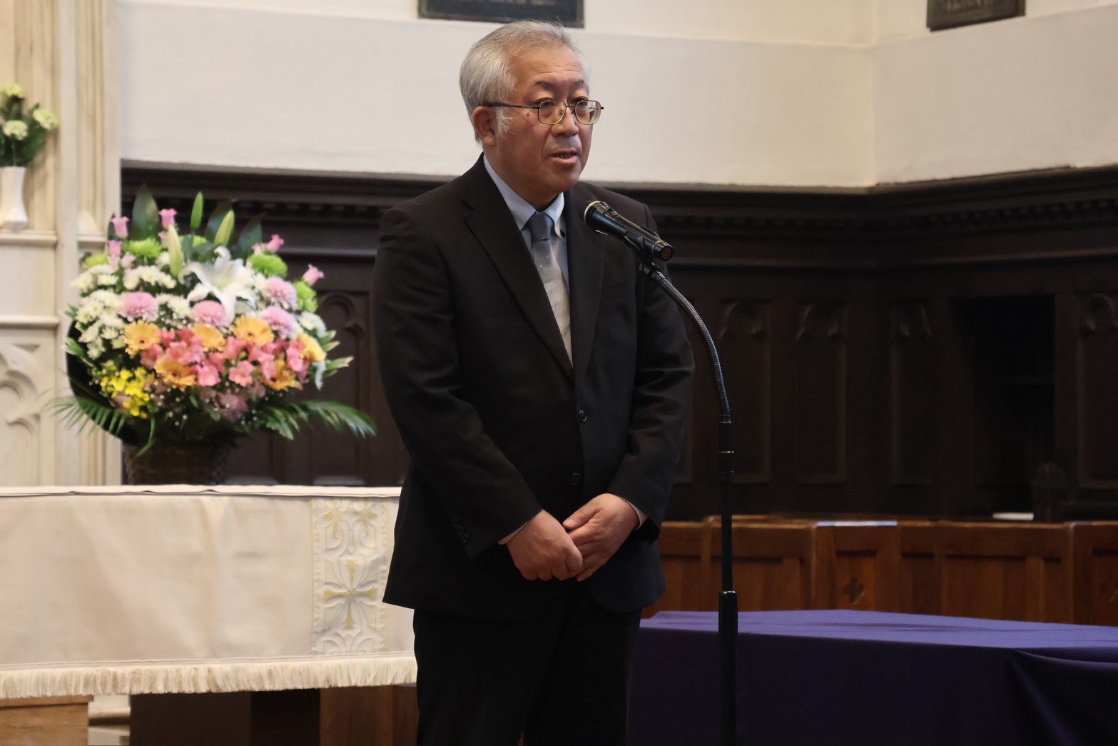 「立教大学野球部のスローガンである”覚悟”は、ただ歯を食いしばって自分を追い込むことだけではないと思っております。キリスト教でいう覚悟は、神に選ばれ、役割を託されていることを信じて、そのことに身を委ねる強さです。人は自分の力ですべてをコントロールしようとすると、ミスしたときに苦しくなってしまういます。しかし、委ねられた一瞬一瞬に誠実に応えようと思えたとき、人は本当の意味で自由にプレーできるのです。100年を超える歴史を持つユニフォームや、信頼の象徴であるゆりの花の入った帽子には、先輩や家族、仲間、そして神の支えが込められています。 だからこそ、ひとりで背負い込むことではなく、支えられている自分を信じて、誠実に、自由に戦ってきてください。」と述べられました。