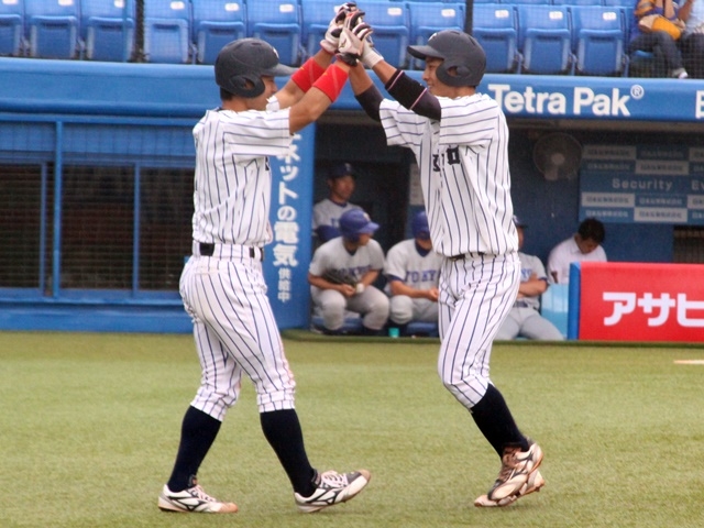 ハイタッチを交わす佐藤拓也(4年)・熊谷敬宥(3年)