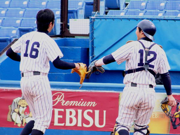 ハイタッチを交わす佐藤勇吾(1年)と山田祐輔(2年)