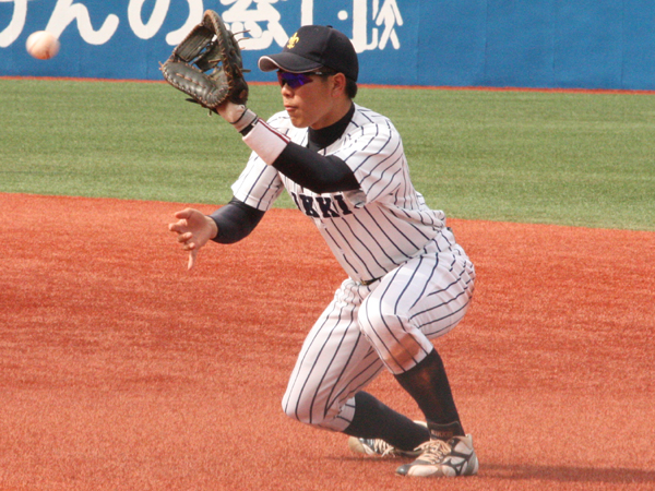 対早大戦、本塁打を放ちガッツポーズをする長谷川直史(4年)